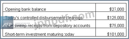 XYZ社のキャッシュマネージャーは、投資または借入の意思決定を行うために、本日の期末のキャッシュポジションを把握しようとしています。キャッシュマネージャーは、本日、税金の支払いとして55,000ドル、仕入先への支払いとして63,000ドルを送金する予定です。さらに、キャッシュマネージャーは、本日、顧客から15,000ドルの送金が会社の集中口座に入金されたこと、そしてXYZ社が3日以内に200,000ドルの債券利息を支払う必要があることを認識しています。