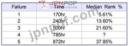 A reliability test of 12 pumps is terminated at 1000 hours. There were 5 failures as follows, what is the median rank % for the 4th failure ?