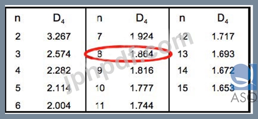 ある工程から得られたデータセットには、サンプルあたり8つの測定値と50個のサンプルが含まれています。50個のサンプルの平均値は12.62です。50個の範囲の平均値は0.18です。ある顧客は、サンプルあたり5つの測定値しか記入できない用紙にSPCチャートを作成することを要求しています。新しい管理限界を計算する準備として、「新しい平均範囲は現在の平均範囲よりも広くなるか、狭くなるか?」という質問が投げかけられます。答えは次のとおりです。