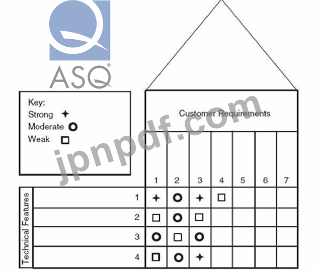このQFDマトリックスはボールペンの設計プロセスで使用されました。15と書かれた四角形に適切な記号はどれですか?