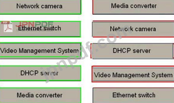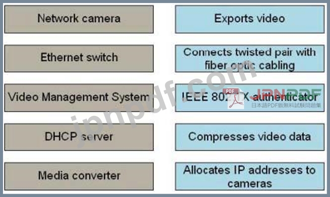 各機能を適切なビデオ監視システムのコンポーネントに関連付けてください。左側の列にある灰色のボックスを、右側の列にある対応する青いボックスにドラッグしてください。