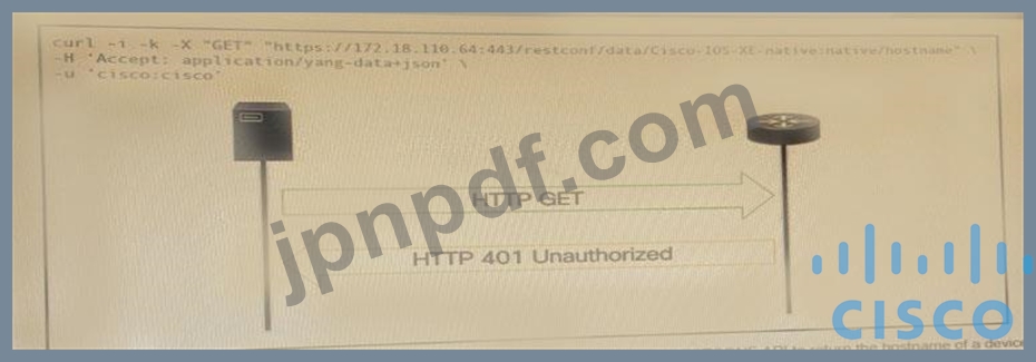 管理者は、Cisco IOS XE RESTOCNF APIを使用してGETを実行し、デバイスのホスト名を返そうとします。シーケンス図は、観察されたHTTPメッセージを示しています。APIリクエストのどの変更で問題が解決しますか?