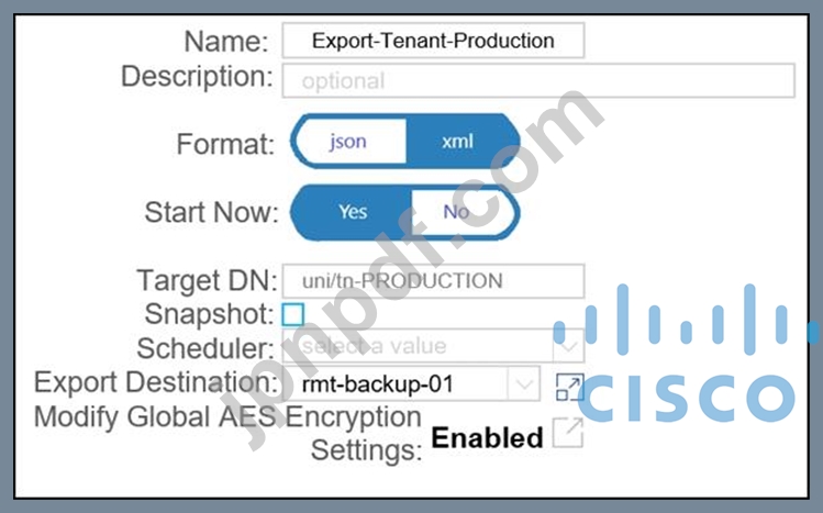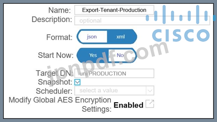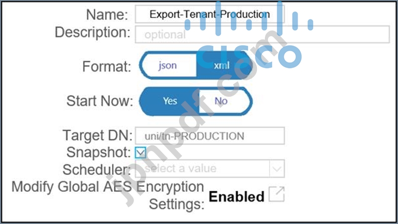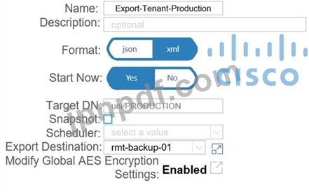 ネットワーク エンジニアは、PRODUCTION テナントをバックアップする必要があります。設定バックアップはマークアップ言語を使用して APIC に保存され、すべての安全な情報が含まれている必要があります。これらの要件を満たすには、どの輸出ポリシーを使用する必要がありますか?