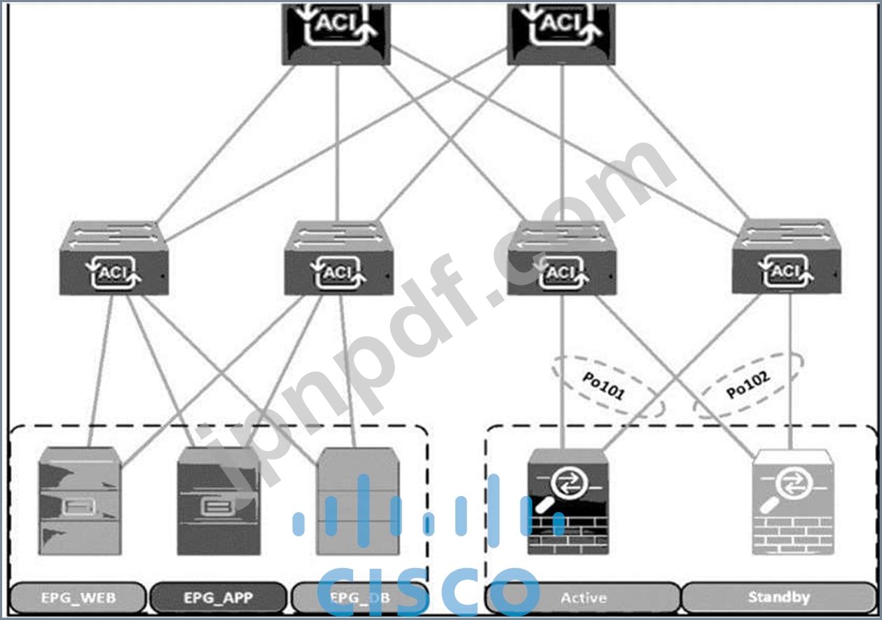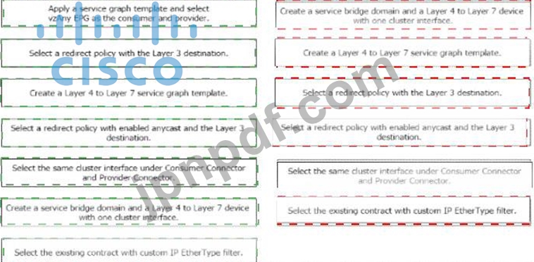 Cisco ACI ファブリックが新たに導入され、セキュリティ チームはすべての EPG 間のトラフィック フローの可視性を高める必要があります。VRF 内のすべてのトラフィックは、既存のファイアウォール ペアに転送する必要があります。フォールオーバー中、スタンバイ ファイアウォールはプライマリ ファイアウォールと同じ IP および MAC を使用し続ける必要があります。左側のステップを右側の実装順序にドラッグ アンド ドロップして、要件を満たすサービス グラフを構成します。(すべてのステップが使用されるわけではありません。)