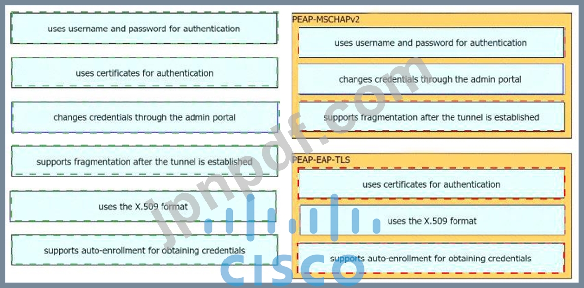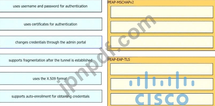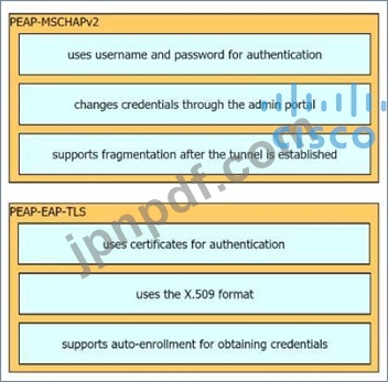 ある組織は802.1Xの実装を検討しており、認証にPEAP-MSCHAPv2とPEAP-EAP-TLSのどちらを使用するか検討しています。左側の特性を右側の対応するプロトコルにドラッグしてください。