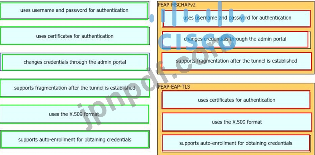 ある組織は802.1Xの実装を検討しており、認証にPEAP-MSCHAPv2とPEAP-EAP-TLSのどちらを使用するか検討しています。左側の特性を右側の対応するプロトコルにドラッグしてください。