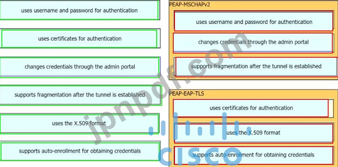 ある組織は802.1Xの実装を検討しており、認証にPEAP-MSCHAPv2とPEAP-EAP-TLSのどちらを使用するか検討しています。左側の特性を右側の対応するプロトコルにドラッグしてください。