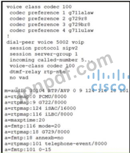 Cisco Unified Border Elementは、INVITEに一致するインバウンドダイヤルピア5002を受信します。アウトバウンドダイヤルピアは、iLBCのみをサポートします。ローカルトランスコーディングインターフェイスが割り当てられます。INVITEメッセージの設定とSDPに基づいて、Cisco Unified BorderElementが着信コールレッグに選択するコーデックはどれですか。