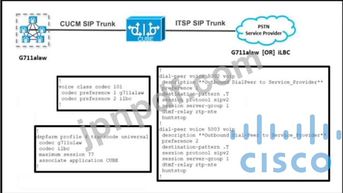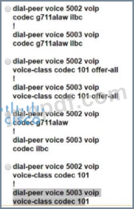サービスプロバイダーへのアウトバウンドコールは、コーデックの不一致が原因で断続的なエラーを引き起こします。内部ネットワークは、G.711A-lawのみを含むアーリーオファーSDPを送信します。サービスプロバイダーは、一部の宛先はG.711 A-lawのみをサポートし、他の宛先はiLBCのみをサポートすると報告しています。また、サービスプロバイダーは、一度に20のアクティブなコールのみを許可します。アウトバウンドダイヤルピア5002および5003を使用して、すべてのコールに対してメディアネゴシエーションを成功させることができる構成はどれですか。