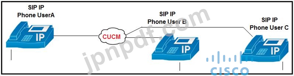 電話機ユーザAと電話機ユーザBの間のアクティブなSIPコールでは、電話機Aが電話機ユーザCへのコール転送を開始します。