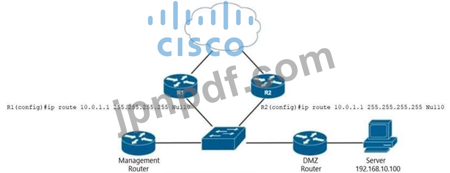 展示を参照してください。EIGRP は内部ルートを交換するためにコア全体で実行され、各ルーターはネットワーク上の他のルーターとの iBGP 隣接関係を維持します。オペレータはエッジ ルータ R1 および R2 で IP アドレス 10.0.1.1 のスタティック ルートを設定しました。これは、示されているようにブラック ホール ルートとして使用されます。タグ付きスタティック ルートを BGP に再配布し、タグ 777 を持つブラックホール トラフィックへのスタティック ルートを作成するルート マップを作成するために、オペレーターが管理ルーターに実装する必要がある構成はどれですか。