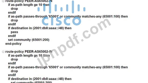 ASN 65001 は ASN 65002 とピアリングして、IPv6 BGP ルートを交換します。ASN 65001 を起点とするすべてのルートの標準コミュニティ値は 65001:100 で、ASN 65002 は 2001 :db8:aaaa::/48 のみをアドバタイズできます。エンジニアは、次の条件を満たすように ASN 65001 ルート フィルタリング構成を更新する必要があります。