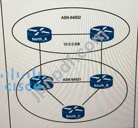 ASN 64501 は現在、低速バックアップ リンクである North_B ルーターを介して 10.0.0.0/8 プレフィックスでネットワークに到達しています。ASN 64502 の管理者は、ASN 64501 から 10.0.0.0/8 へのトラフィックがプライマリ リンク North_A 経由で移動することを望んでいます。このタスクを達成するネットワーク構成の変更はどれですか?
