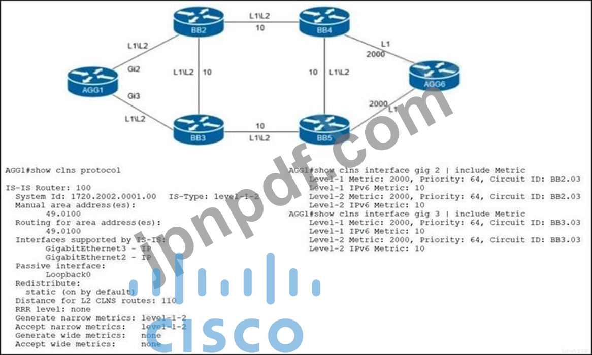 展示を参照してください。エンジニアが ISP ネットワークで IS-IS を構成しています。BB3 コア ルーター経由でルーター AGG6 への接続を確立するために、エンジニアがルーター AGG1 に実装する必要がある IS-IS 構成はどれですか?
