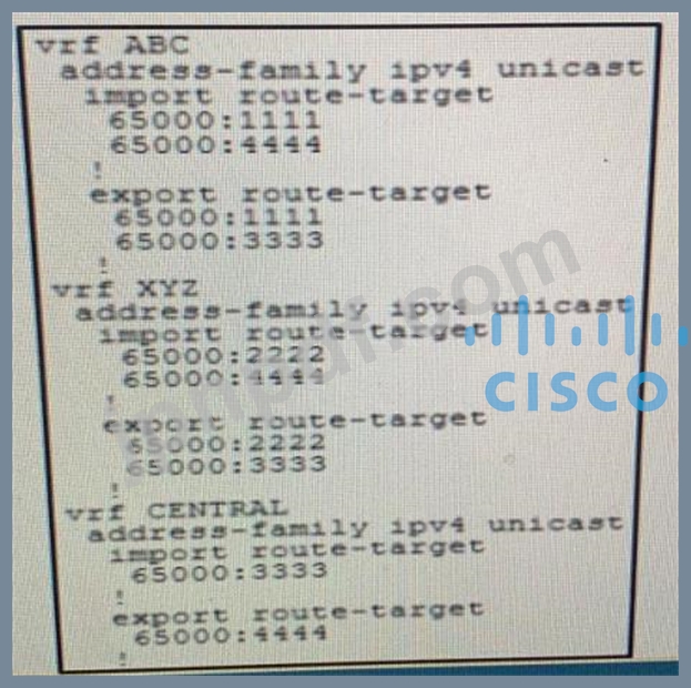 エンジニアは、VRF ABC と XYZ が VRF CENTRAL と通信できるように重複する VPN を設定していますが、VRF ABC と XYZ が通信できないようにしたいと考えています。これらの目的を達成する構成はどれですか?