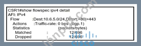 展示を参照してください。ネットワーク オペレータは最近、内部 IT ネットワーク用に BGP FlowSpec を構成しました。ネットワーク上に展開された構成から何が推測されるのでしょうか?