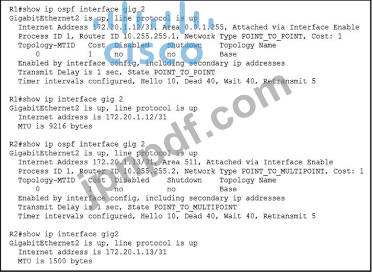 展示を参照してください。エンジニアは、ルータ R1 と R2 の間の OSPF 隣接関係のトラブルシューティングを行っているときに、両方のルータが EXCHANGE/EXSTART 状態でスタックしていることに気付きました。
