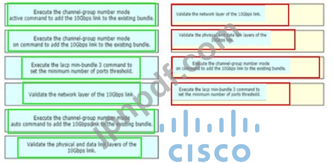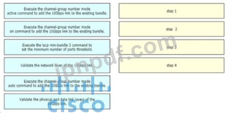 ネットワーク エンジニアは、既存の 2X1Gbps LACP ベースの LAG に 10Gbps リンクを追加して、その容量を増強しています。ネットワーク標準では、メンバー リンクの 1 つがダウンした場合、バンドル インターフェイスのサービスを停止し、運用ネットワークへの影響を最小限に抑えて新しいリンクを追加する必要があります。エンジニアが実行する必要があるタスクを左側から右側のシーケンスにドラッグ アンド ドロップします。すべてのオプションが使用されるわけではありません。