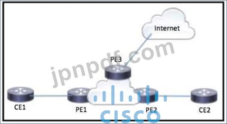 展示を参照してください。CE1 と CE2 は、PE3 に接続された ISP を介してインターネットに接続する必要があります。エンジニアはこのタスクを完了するために何を構成する必要がありますか?