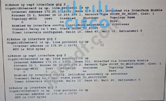 エンジニアは、ルータ R1 と R2 の間の OSPF 隣接関係のトラブルシューティングを行っているときに、両方のルータが EXCHANGE/EXSTART 状態でスタックしていることに気付きました。進行中の問題を解決するには、エンジニアは何を修正する必要がありますか?