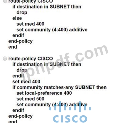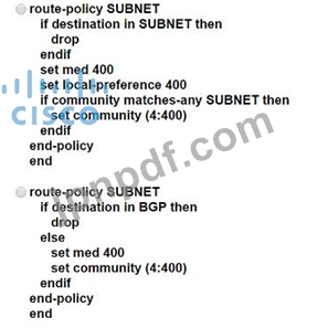 ネットワーク エンジニアは、SUBNET プレフィックス セットの BGP ルート ポリシーを構成しています。一致するトラフィックはドロップする必要があり、他のトラフィックの MED 値は 400 に設定され、コミュニティ 4:400 がルートに追加される必要があります。エンジニアはどの構成を適用する必要がありますか?