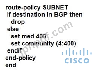 ネットワーク エンジニアは、SUBNET プレフィックス セットの BGP ルート ポリシーを構成しています。一致するトラフィックはドロップする必要があり、他のトラフィックの MED 値は 400 に設定され、コミュニティ 4:400 がルートに追加される必要があります。エンジニアはどの構成を適用する必要がありますか?
