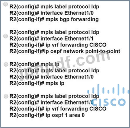 エンジニアは、2 つのルータ間で MPLSLDP セッションをサポートするように 2 つのルータを設定しています。R1 の構成が完了し、図に示すように R2 での作業が開始されました。タスクを完了するには、エンジニアが R2 に適用する必要がある追加構成はどれですか?