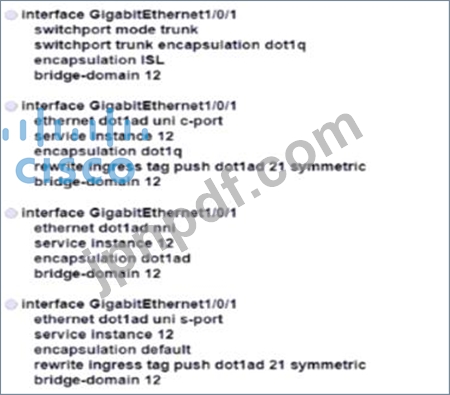 エンジニアは、次の要件を満たす新しいスイッチポートに 802.1ad 準拠の構成を適用する必要があります。スイッチポートは、ポートに入るときにすべてのトラフィックにタグを付ける必要があります。 スイッチポートは、どの顧客 VLAN からのトラフィックにも同じレベルのサービスを提供することが期待されます。 エンジニアはどの設定を使用する必要がありますか?