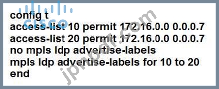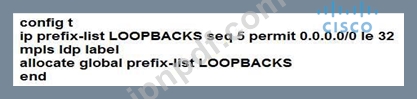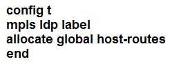 展示を参照してください。LDP LIB サイズを削減し、/32 ループバック IP スペースのみのラベル バインディングをアドバタイズするには、ネットワーク上の 4 つのルータのそれぞれにどの設定を適用する必要がありますか?