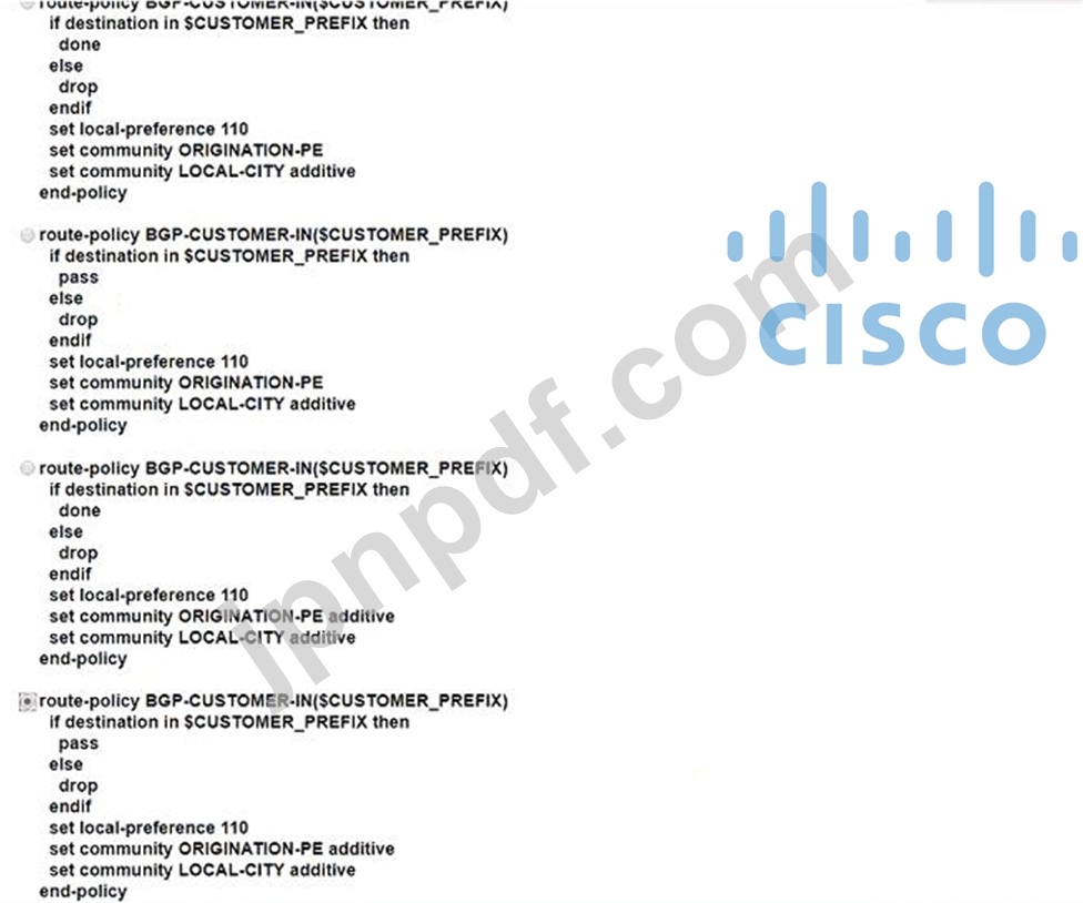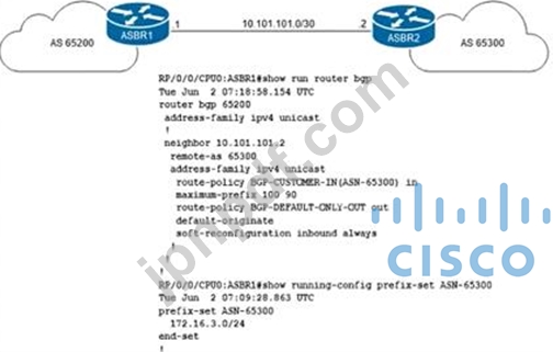 ネットワーク エンジニアは、次の要件を持つ標準の顧客ルート ポリシーを ASBR1 に実装しています。