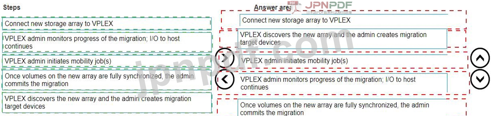 The correct order of steps to migrate from an old array to a new one without disruption using VPLEX is as follows: