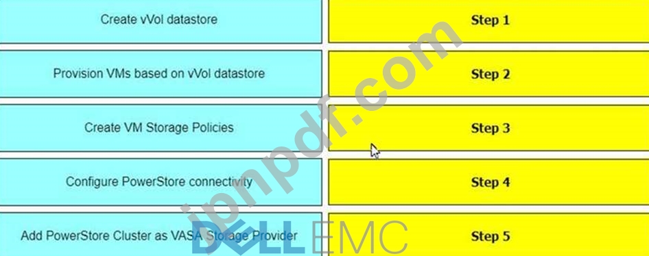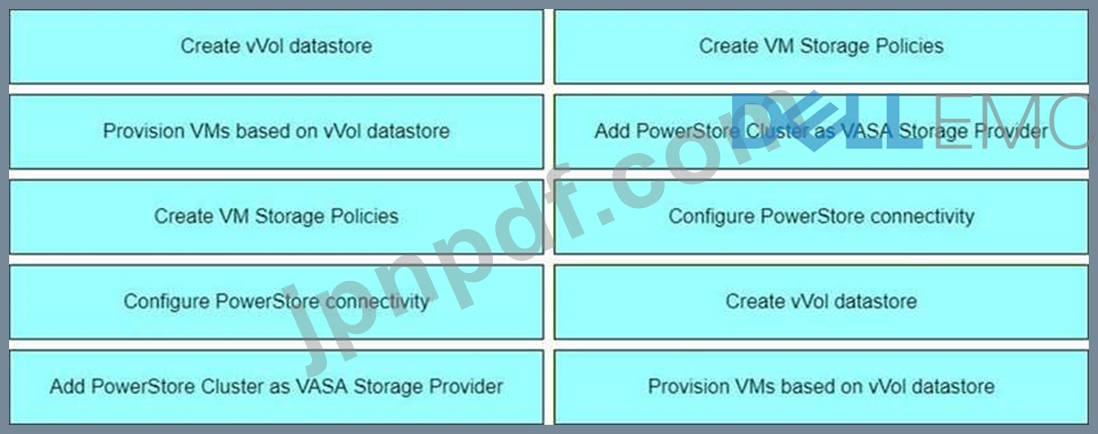 vCenter で、Dell EMC Power Store システムにプロビジョニングされたストレージ コンテナに VM を作成する手順の正しい順序は何ですか?