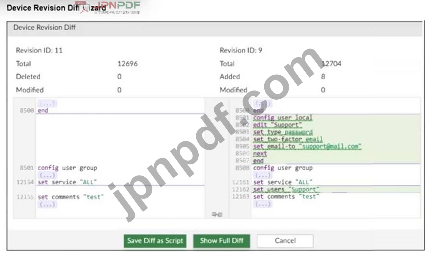 Refer to the exhibits. An administrator needed to recover all the configurations related to the user, Support. The configurations were saved in configuration revision ID 9.