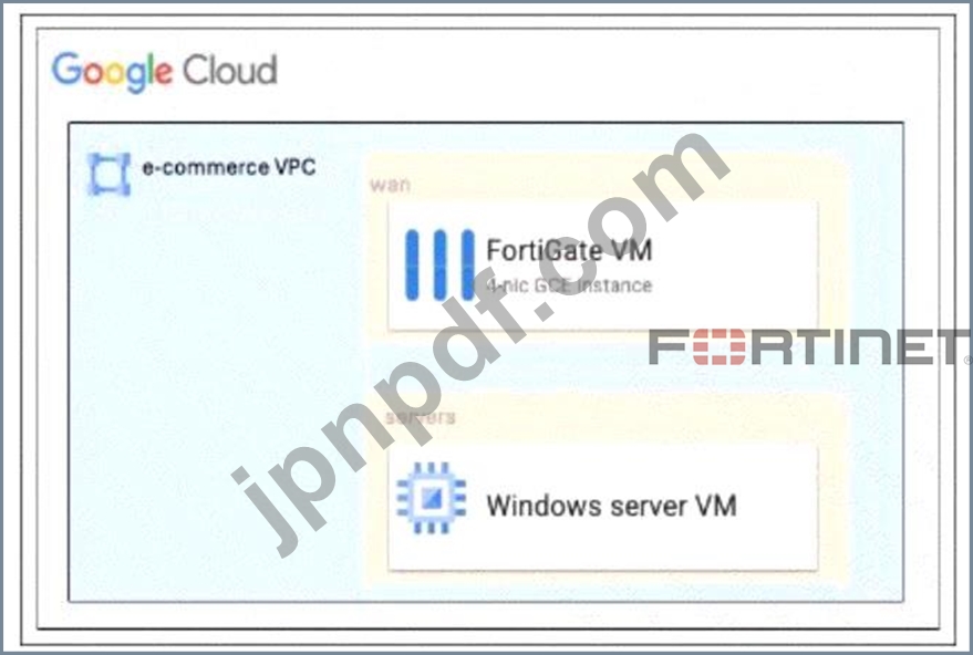 1台のVMは、VPC「e-commerce」内のサブネット「wan」に配置されたFortiGateです。もう1台のVMは、同じくVPC「e-commerce」内のサブネット「servers」に配置されたWindowsサーバーです。