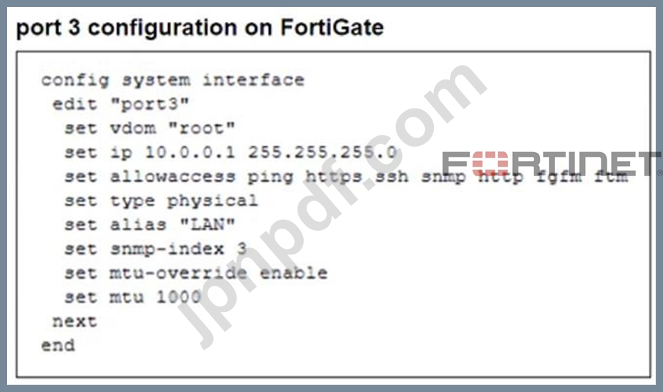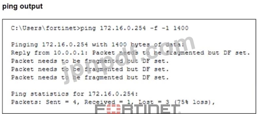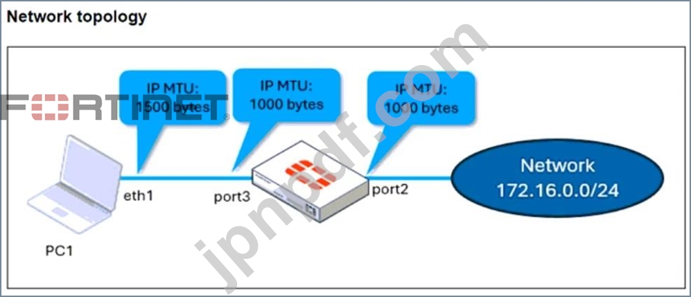 デフォルトの MTU が 1500 バイトであるユーザーの Windows PC の構成と、MTU が 1000 バイトに設定された FortiGate インターフェース、および PC1 からサーバー 172.16.0.254 への ping 結果が表示されます。