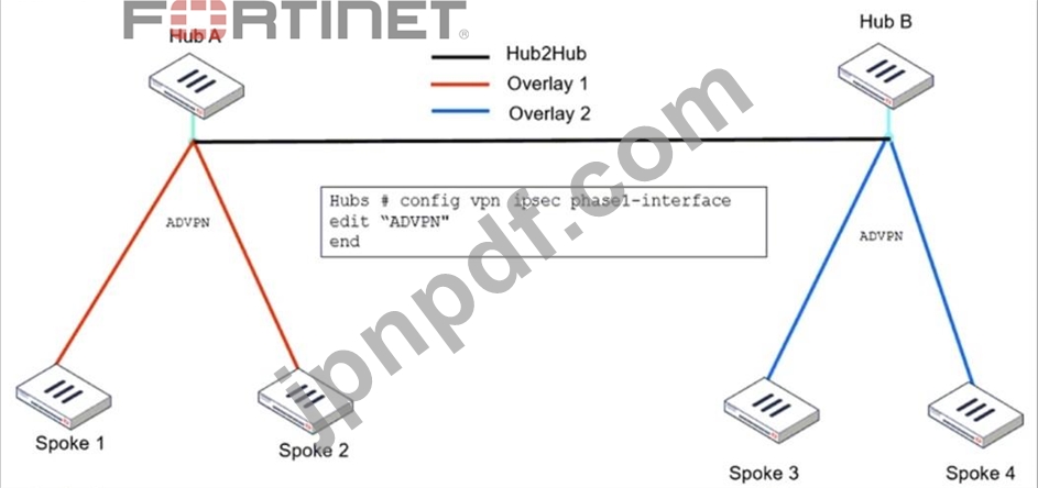 図を参照してください。これは、ハブ A からスポーク 1 およびスポーク 2、およびハブ # からスポーク 3 およびスポーク 4 までの VPN IPsec フェーズ 1 を表す ADVPN IPsec インターフェイスを示しています。