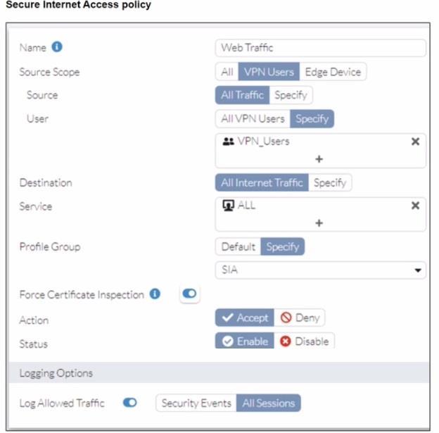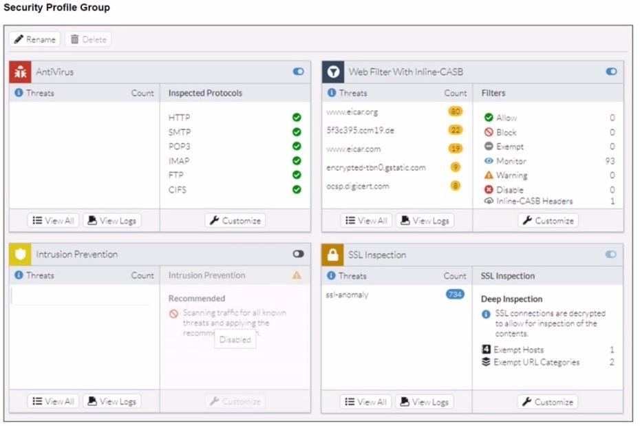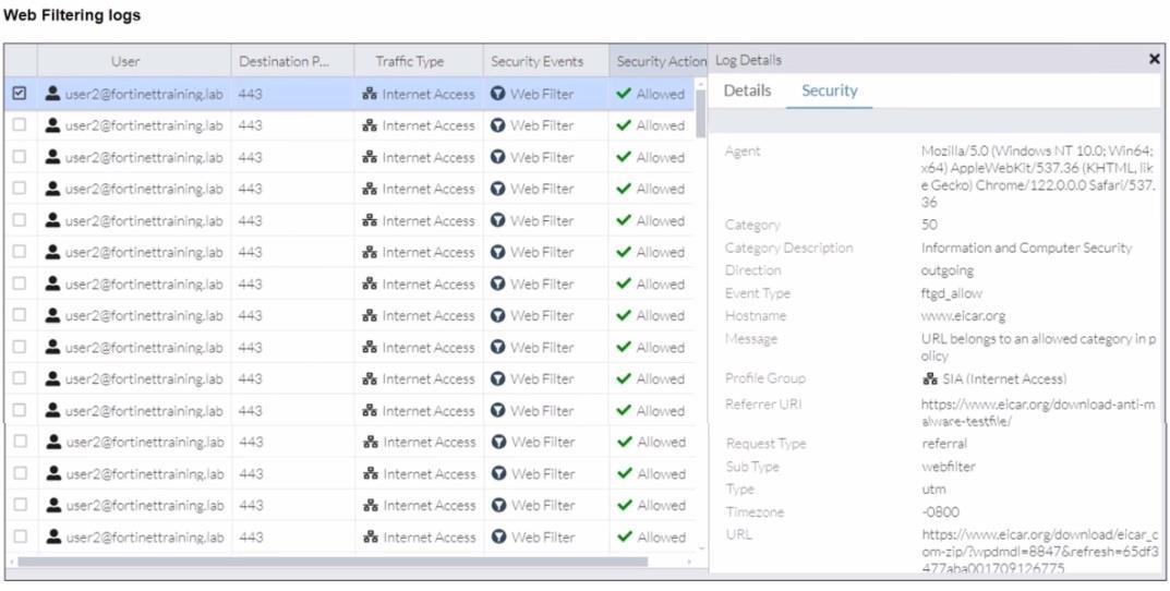 添付資料を参照してください。FortiSASE管理者は、セキュリティプロファイルグループにウイルス対策プロファイルを設定し、インターネットアクセスポリシーに適用しました。リモートユーザーは引き続きhttps://eicar.orgからeicar.com-zipファイルをダウンロードできます。トラフィックログには、ポリシーによってトラフィックが許可されていることが示されています。