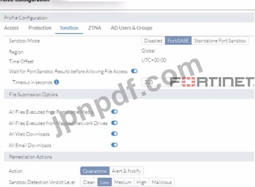 示されている構成に基づいて、FortiSandbox 検査を必要とするセッションを FortiSASE が処理する 2 つの方法はどれですか (2 つ選択してください)。