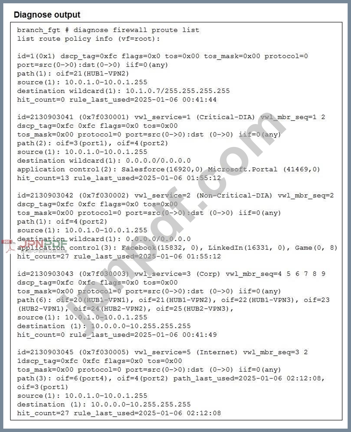 Based on the exhibits, which interface uses branch 1_fgt to steer the test traffic?