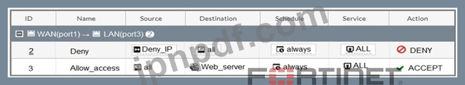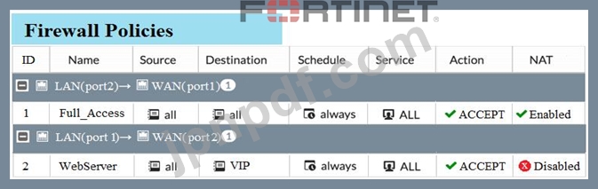 最初のファイアウォール ポリシーでは、送信インターフェイス アドレスで NAT が有効になっています。2 番目のファイアウォール ポリシーは、宛先アドレスとして VIP を使用して構成されています。