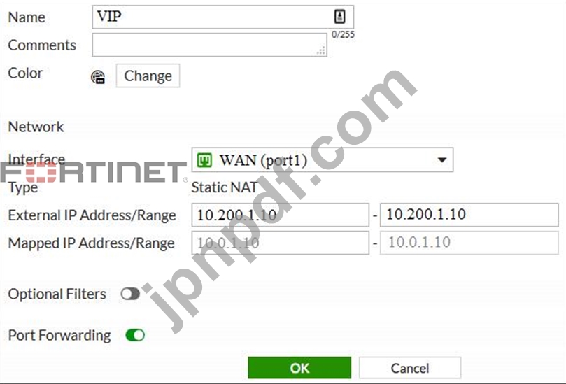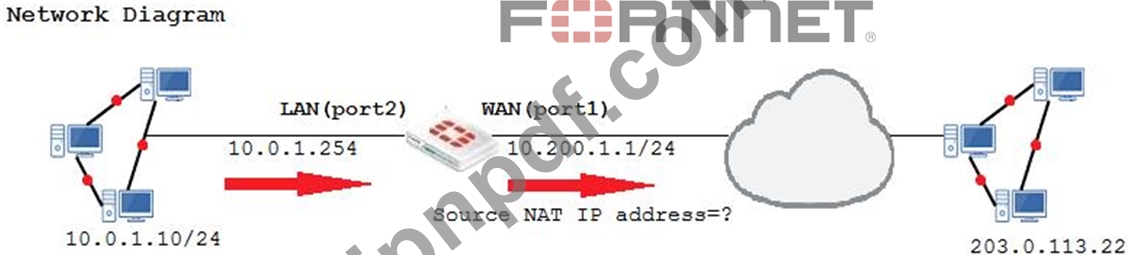 WAN (port1) インターフェイスの IP アドレスは 10.200.1.1/24 です。LAN (port2) インターフェイスの IP アドレスは 10.0.1.254/24 です。