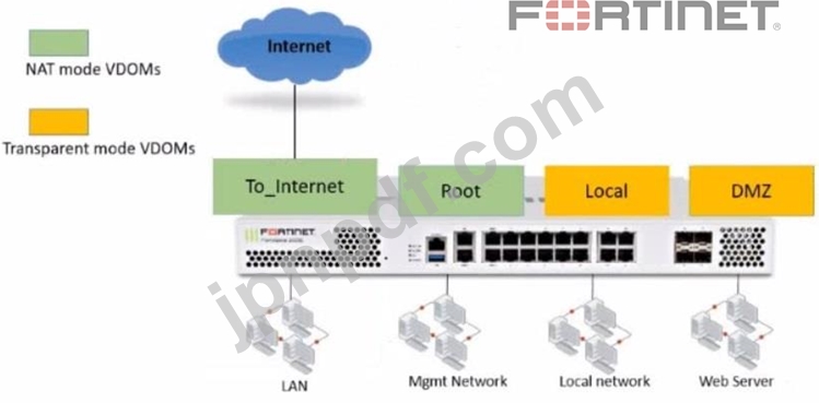 Root および To_Internet VDOM は NAT モードで構成されます。DMZ とローカル VDOM はトランスペアレント モードで構成されます。