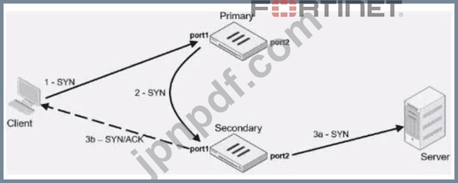 トラフィック フロー中に、プライマリ FortiGate は SYN パケットをセカンダリ FortiGate に転送します。