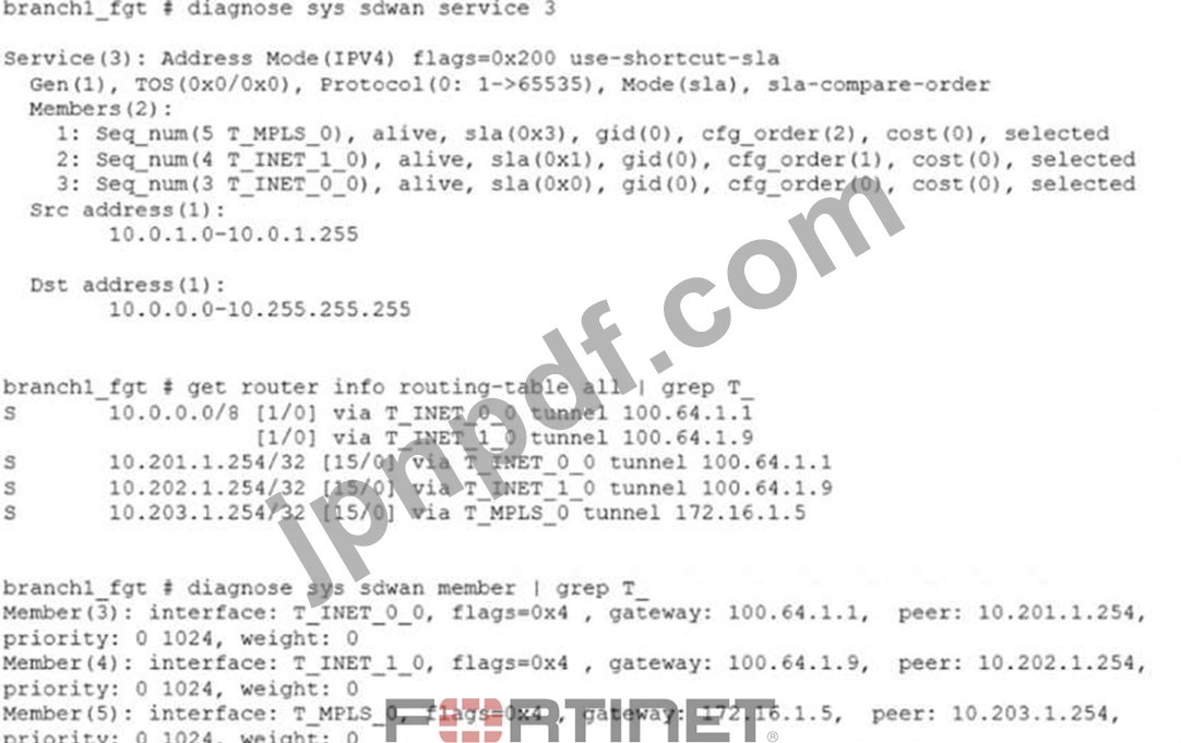 図 A は SD-WAN ルールの構成を示し、図 B はそれぞれのルールのステータス、ルーティング テーブル、およびメンバーのステータスを示します。