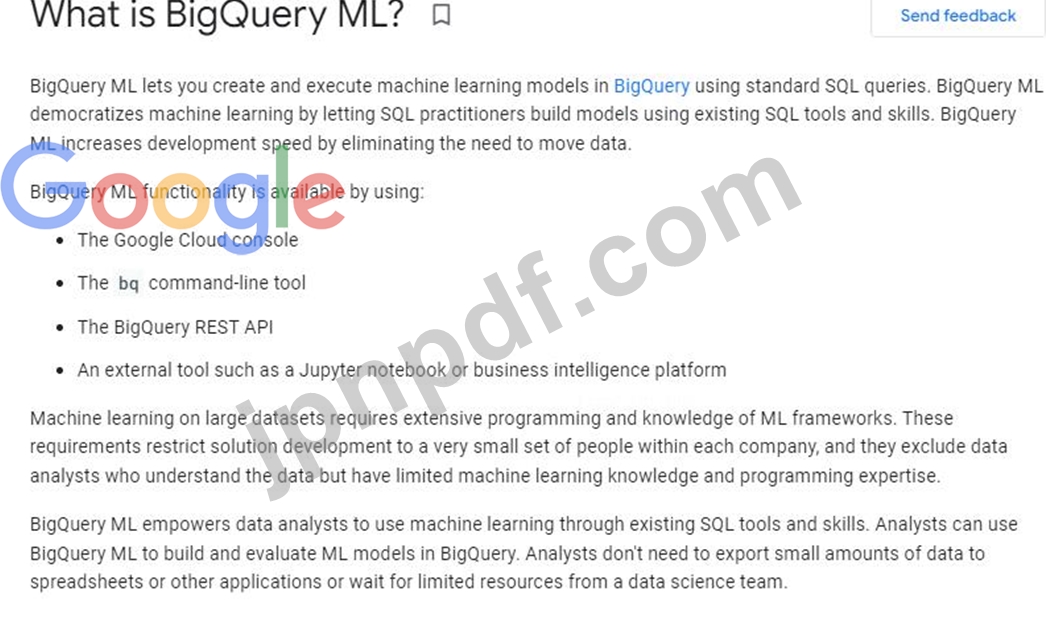 標準 SQL とデータ ウェアハウスのデータを使用して機械学習モデルを構築できる Google Cloud サービスまたは機能はどれですか?