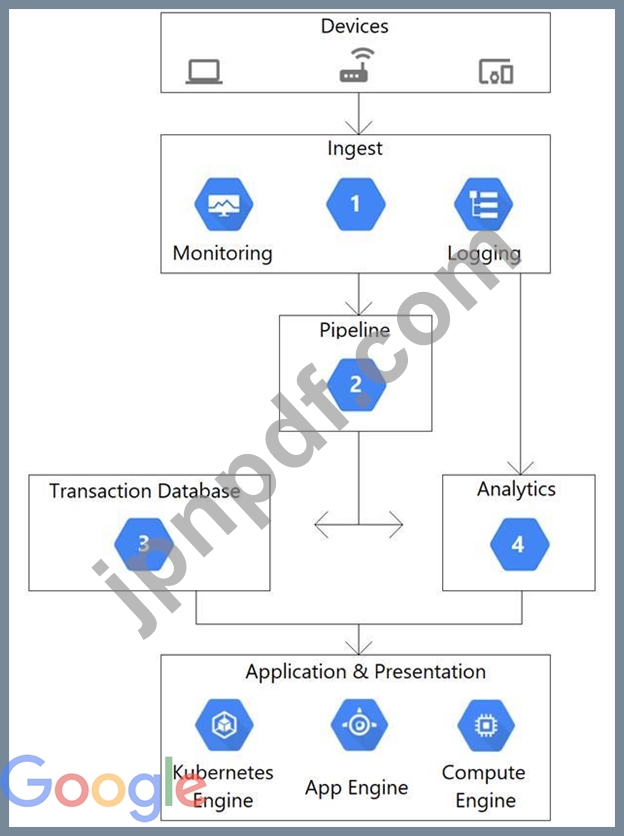 このアーキテクチャ図は、数千のデバイスからデータをストリーミングするシステムを示しています。データをパイプラインに取り込み、データを保存し、SQL ステートメントを使用してデータを分析したいと考えています。ステップ 1、2、3、4 ではどの Google Cloud サービスを使用する必要がありますか?