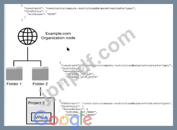 次のリソース階層があります。図に示すように、階層内の各ノードに組織ポリシーがあります。VPC A で拒否されるロード バランサーのタイプはどれですか?