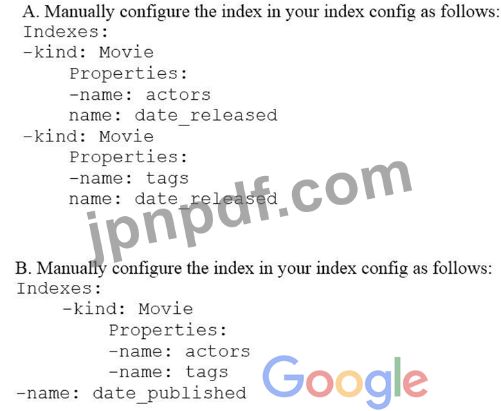 `tags' には複数の値がありますが、プロパティ `date release' には複数の値がありません。一般的なクエリでは、actor=<actorname> を持つすべての映画を date_release 順に並べ替えるか、tag=Comedy を持つすべての映画を date_release 順に並べ替えるように求められます。インデックス数の組み合わせ爆発をどのように回避すべきでしょうか?