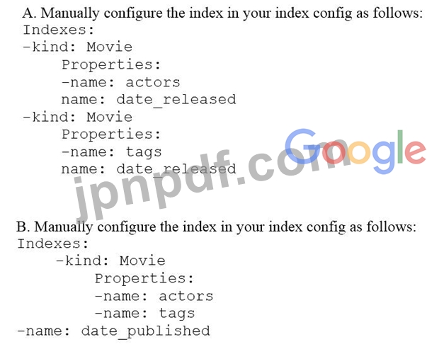 あなたは、メディア ストリーミング サービスであるモバイル アプリケーション用の新しいストレージ システムを展開しています。最適なのは Google Cloud Datastore であると判断します。複数のプロパティを持つエンティティがあり、その一部は複数の値を取ることができます。たとえば、エンティティ「Movie」では、プロパティ「actors」とプロパティ「tags」には複数の値がありますが、プロパティ「date release」には複数の値がありません。一般的なクエリでは、actor=<actorname> を持つすべての映画を date_release 順に並べるか、tag=Comedy を持つすべての映画を date_release 順に要求します。インデックス数の組み合わせ爆発をどのように回避すべきでしょうか?