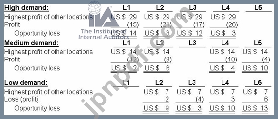 推定利益に加えて、銀行の経営陣が高、中、低の需要の確率をそれぞれ0.3、0.4、0.3と評価した場合、場所L4を選択することで予想される機会損失はどのくらいですか。